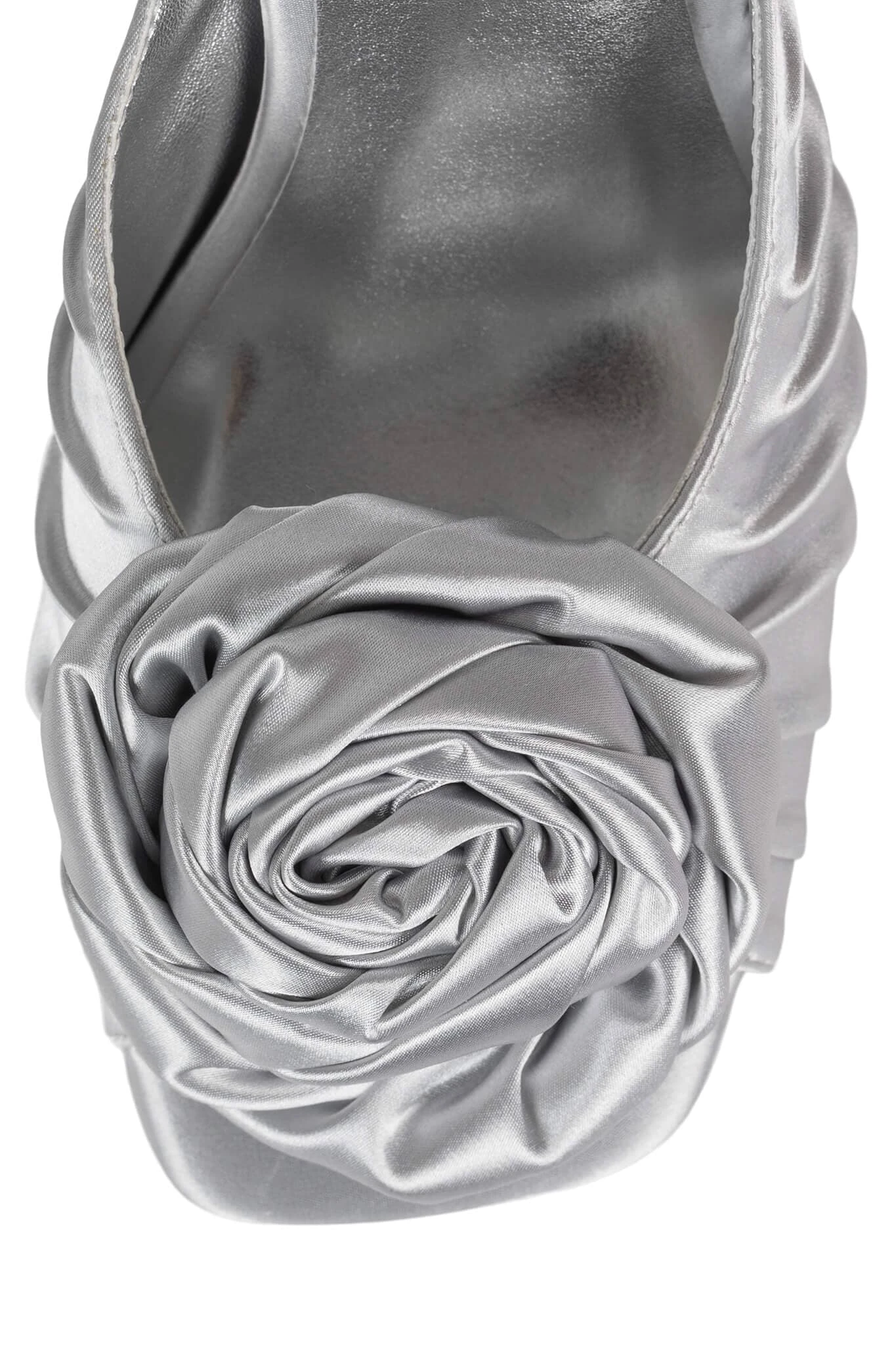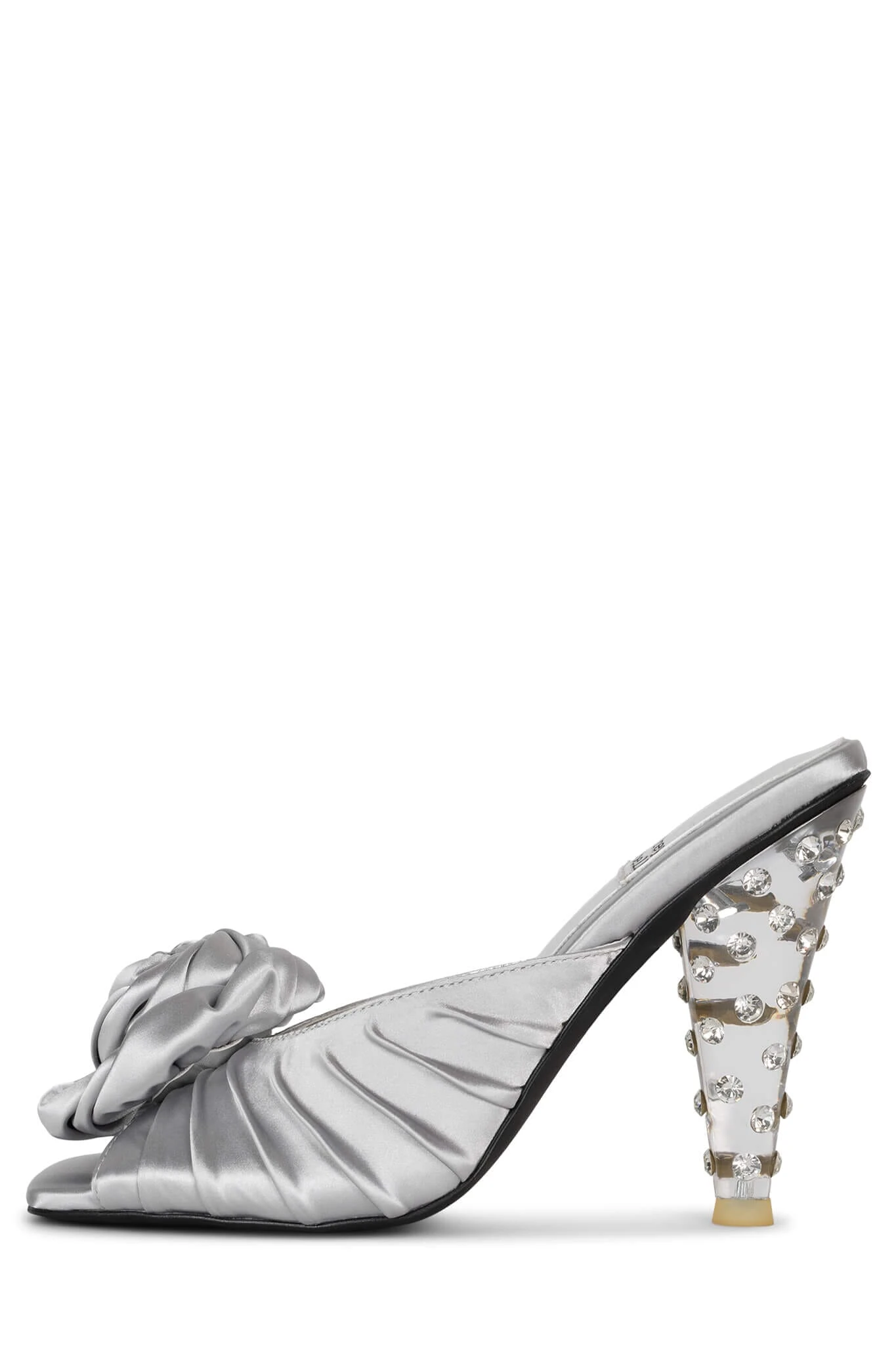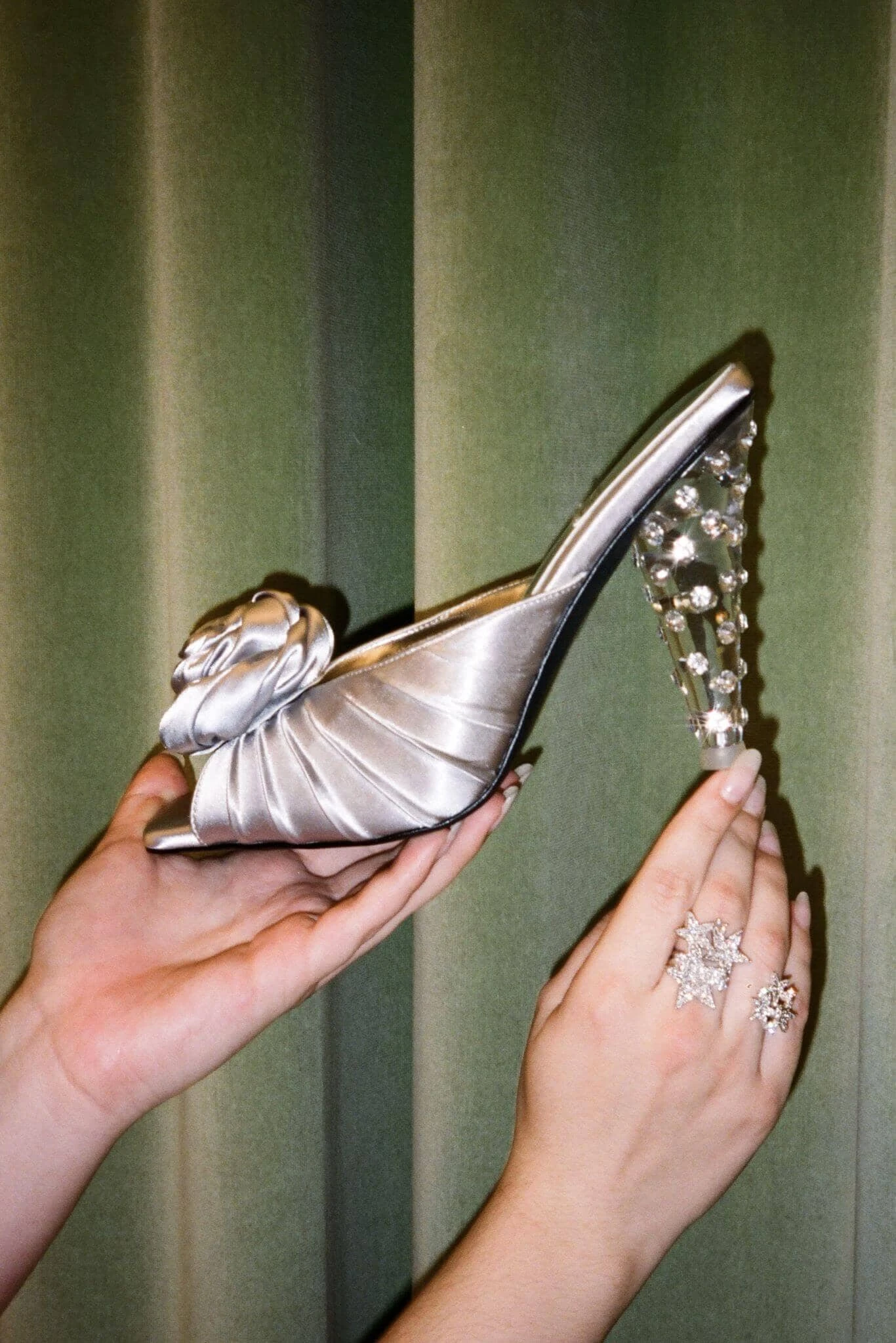 Open-toe heeled mule with rosette and jeweled lucite heel