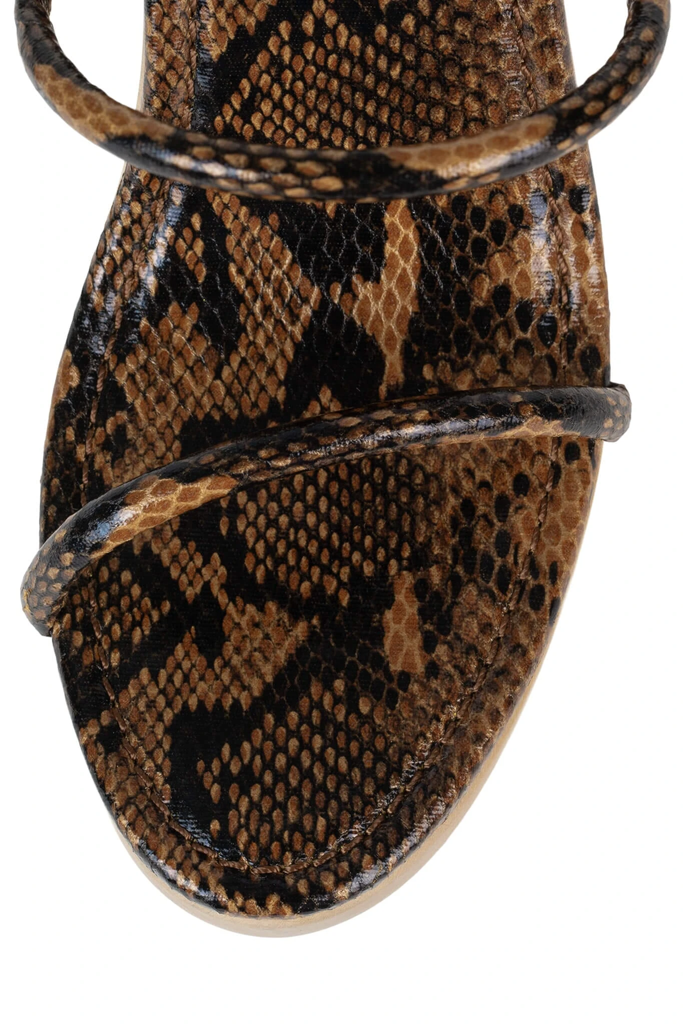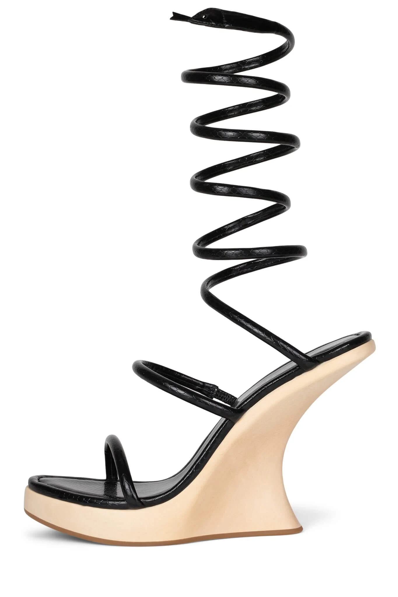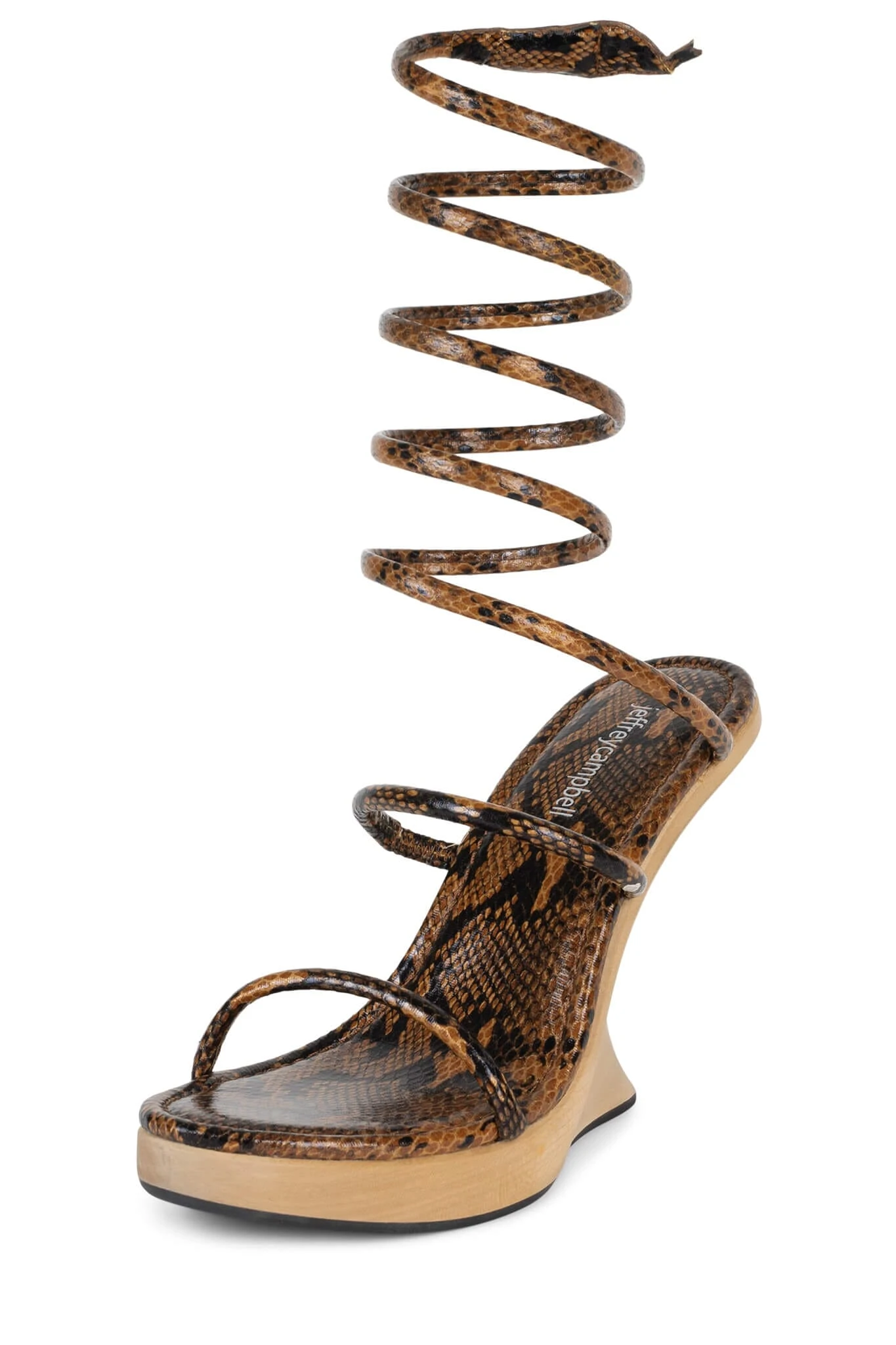 Sculpted wooden wedge platform sandal with snake detail mid-calf ankle wrap