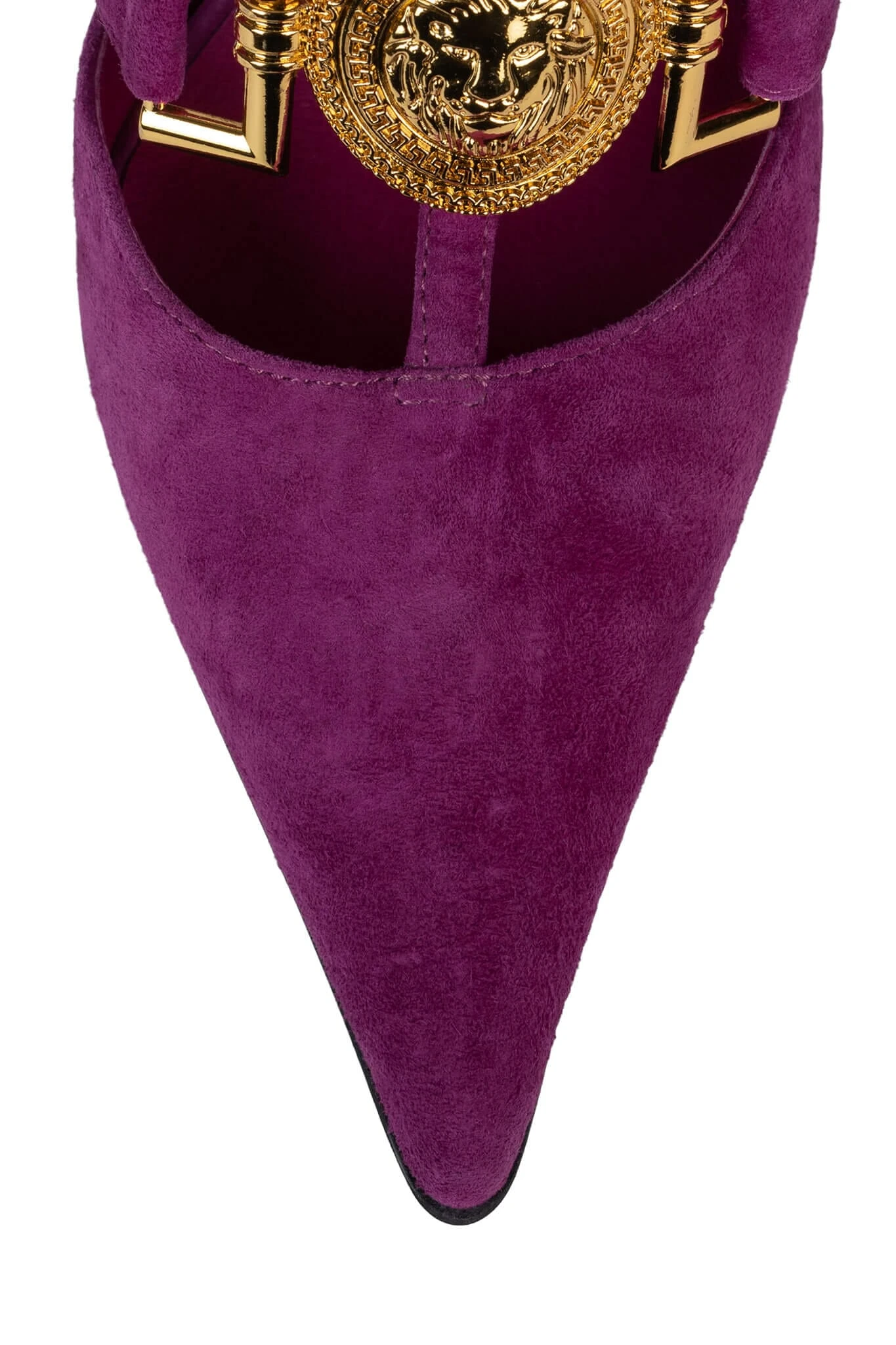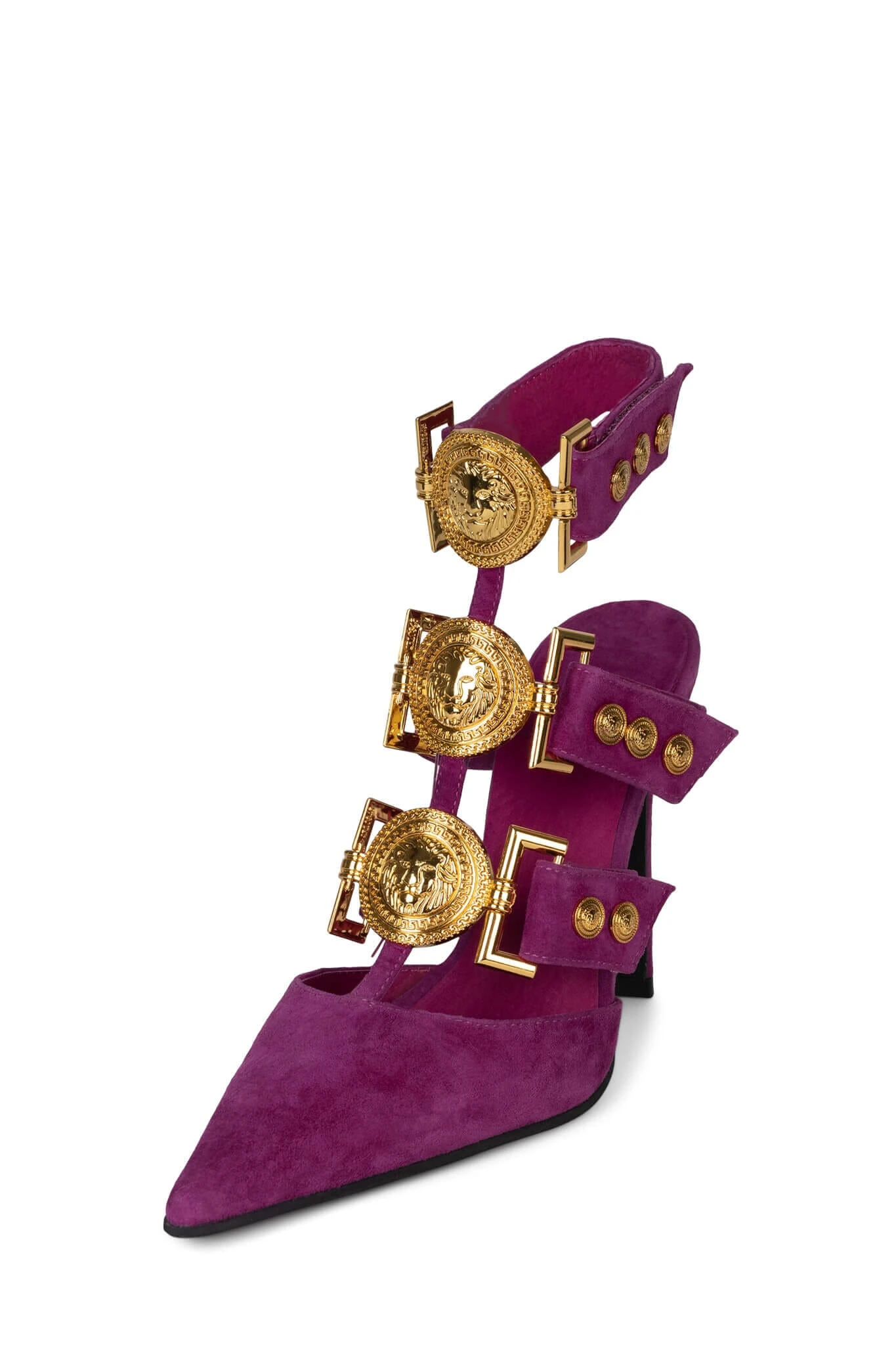 Pointed-toe strappy heeled mule with gold lion emblems
