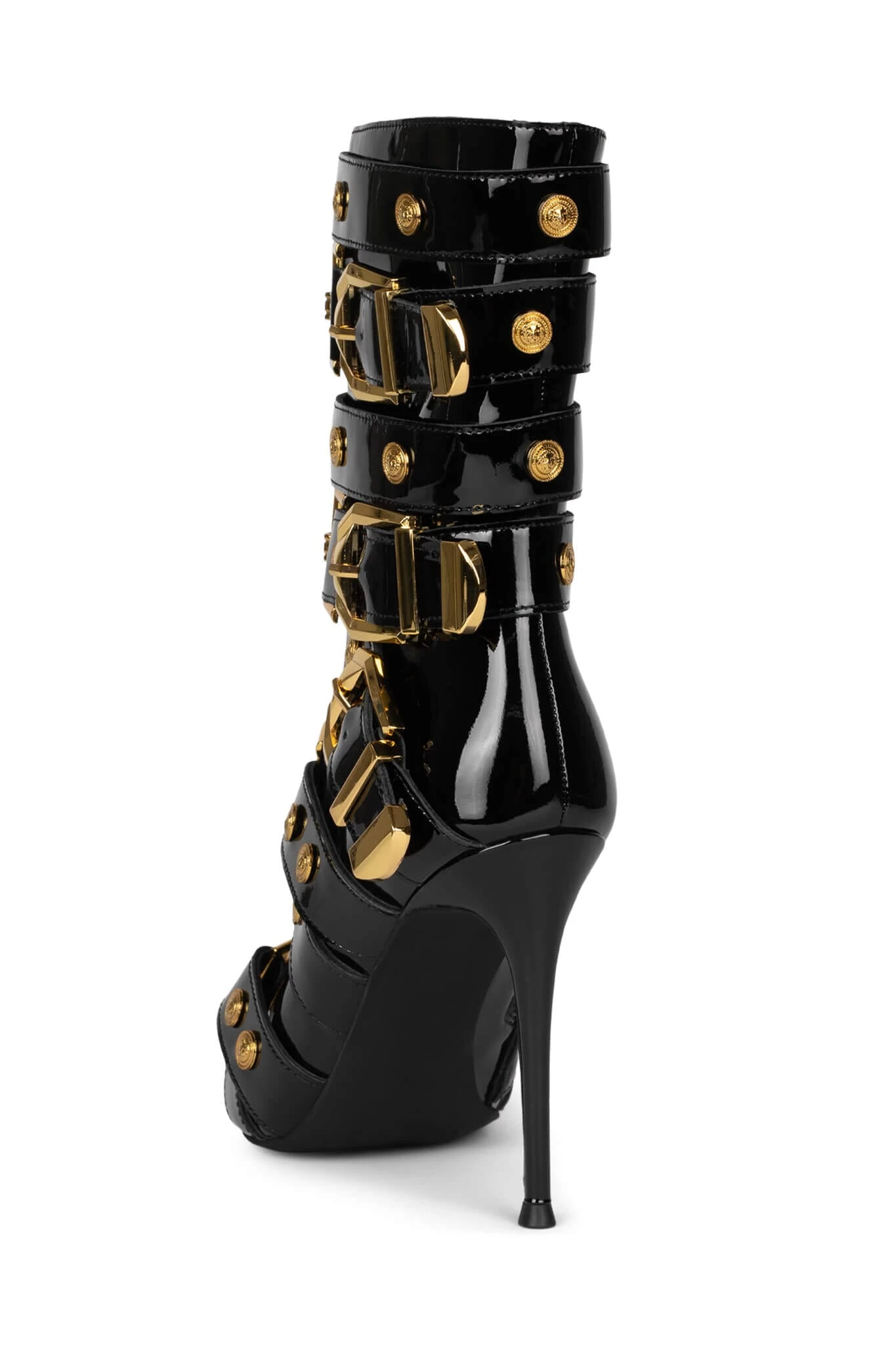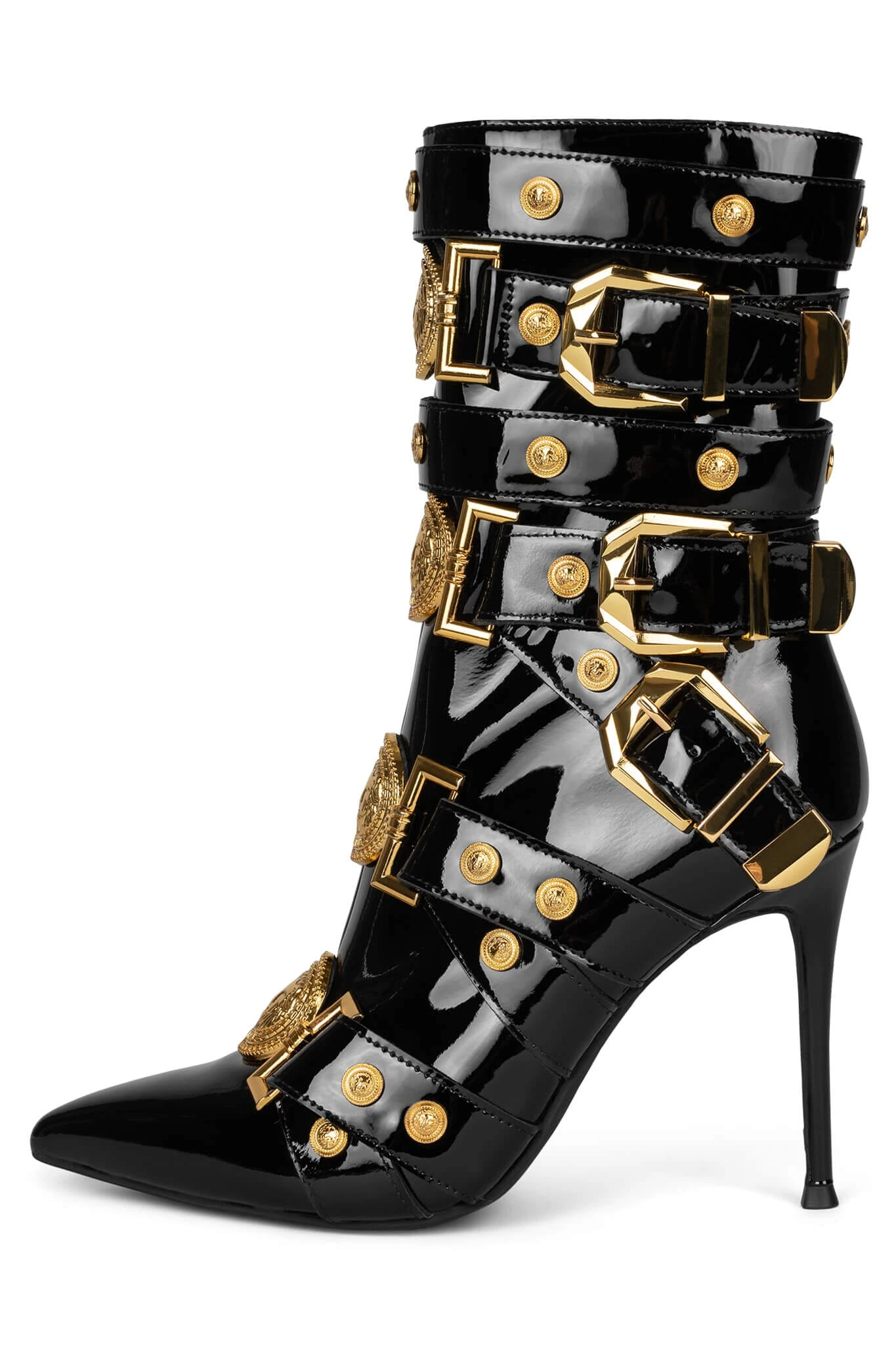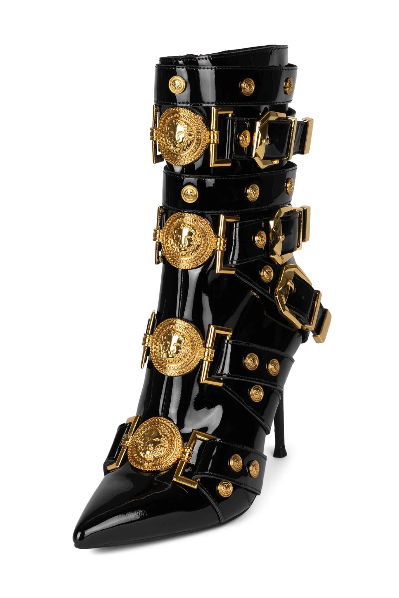 Strappy buckled mid-calf stiletto boot with gold lion emblems