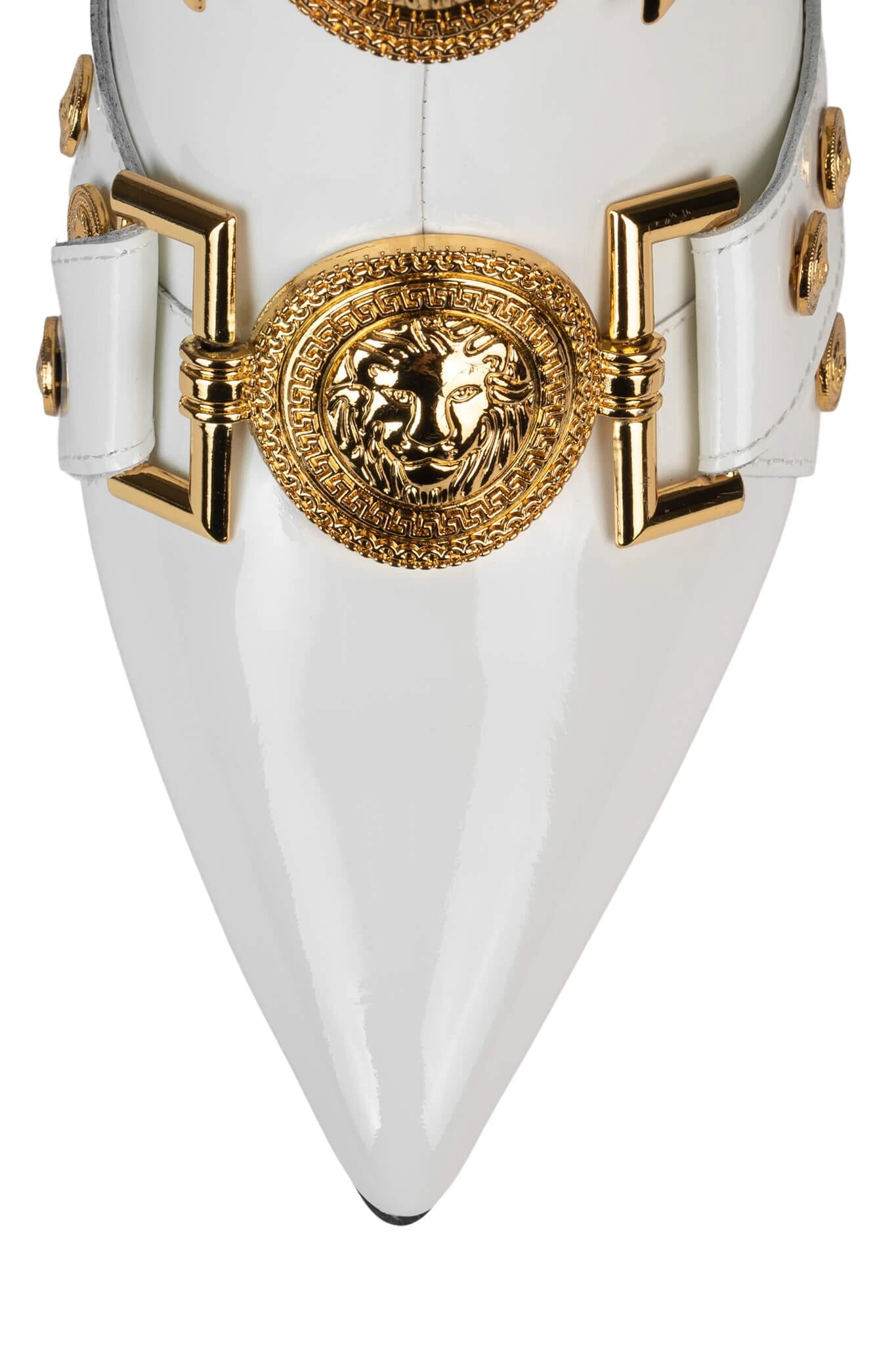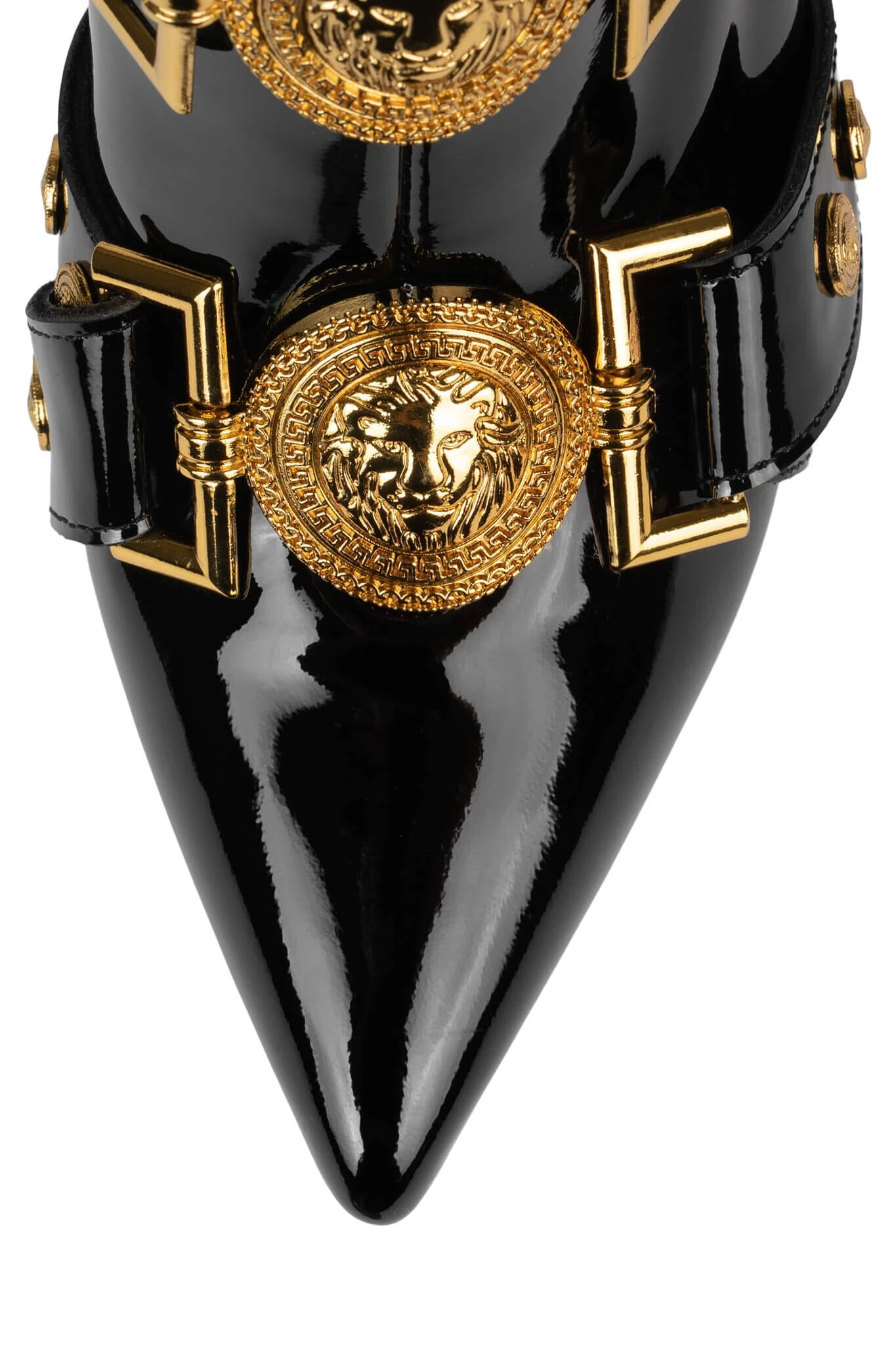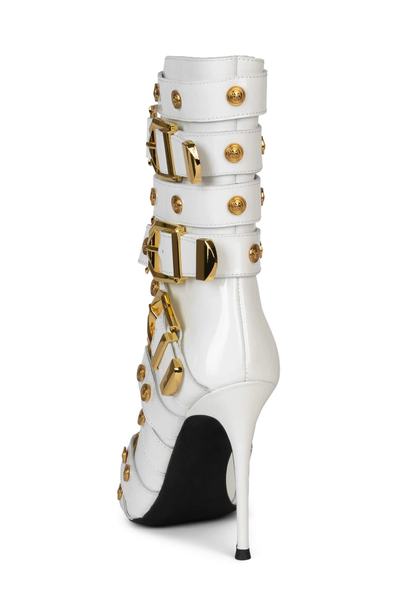 Strappy buckled mid-calf stiletto boot with gold lion emblems
