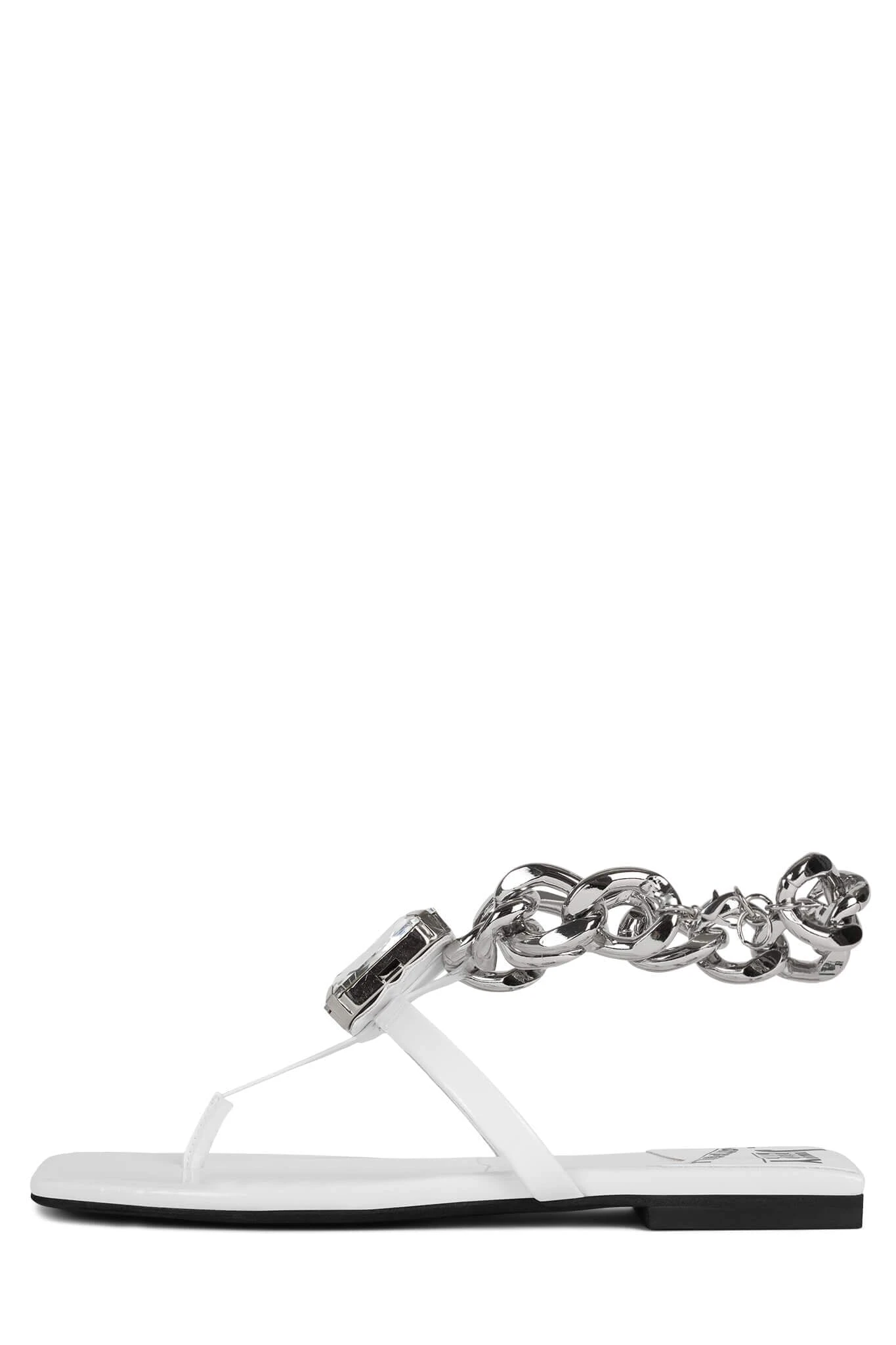 Flat thong sandal with chain ankle strap and jewel ornament