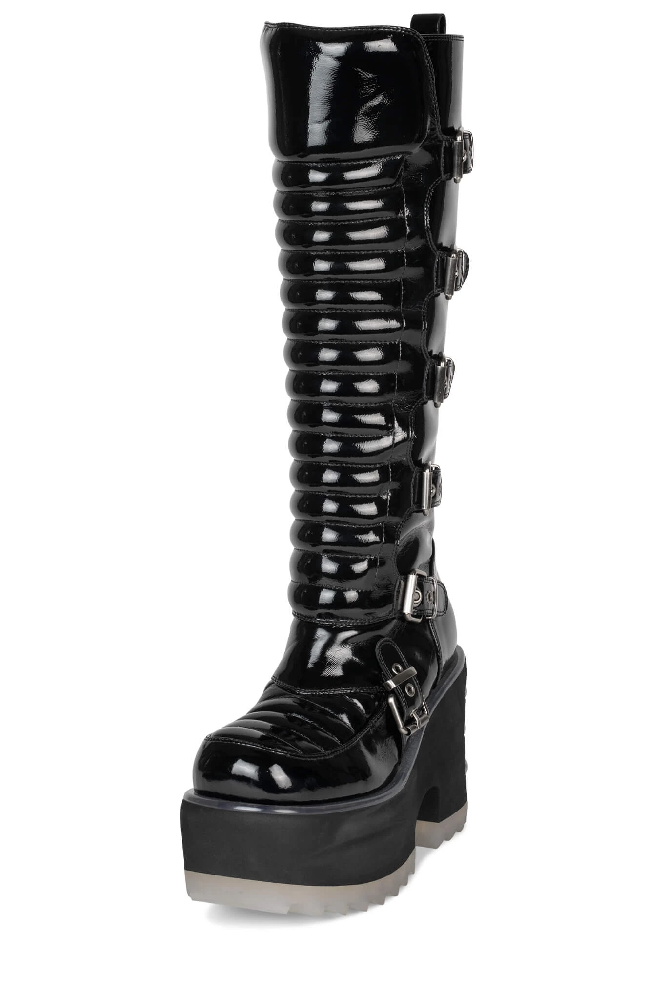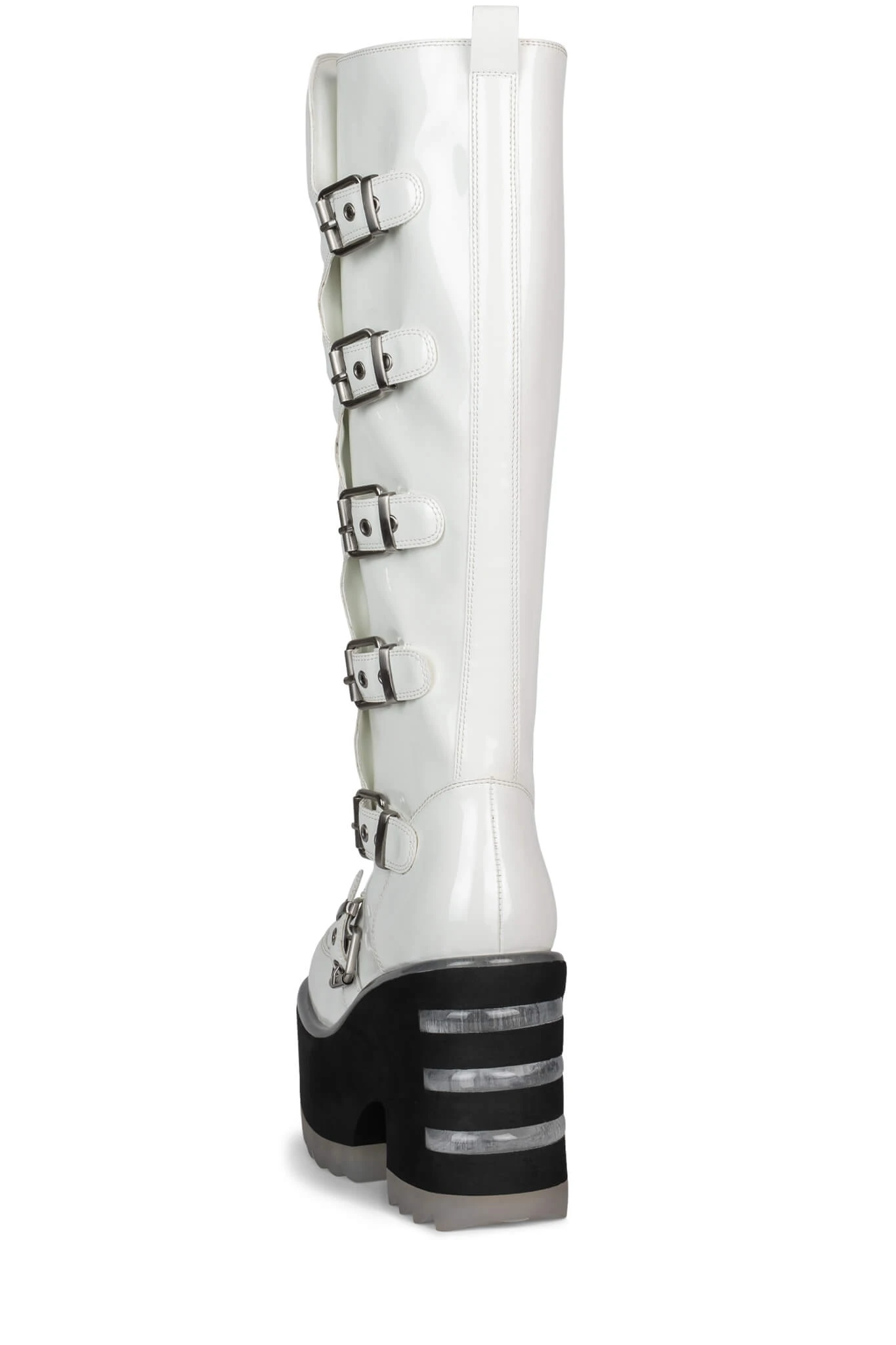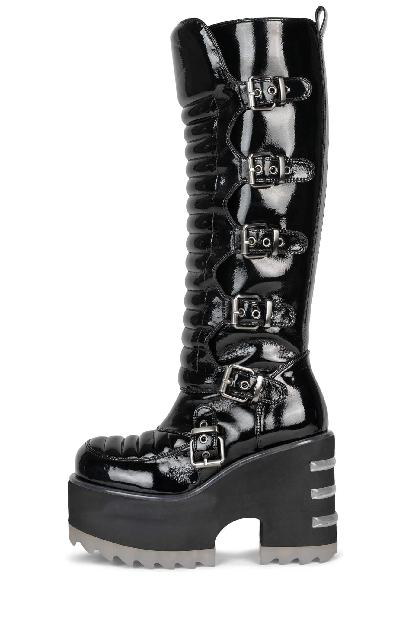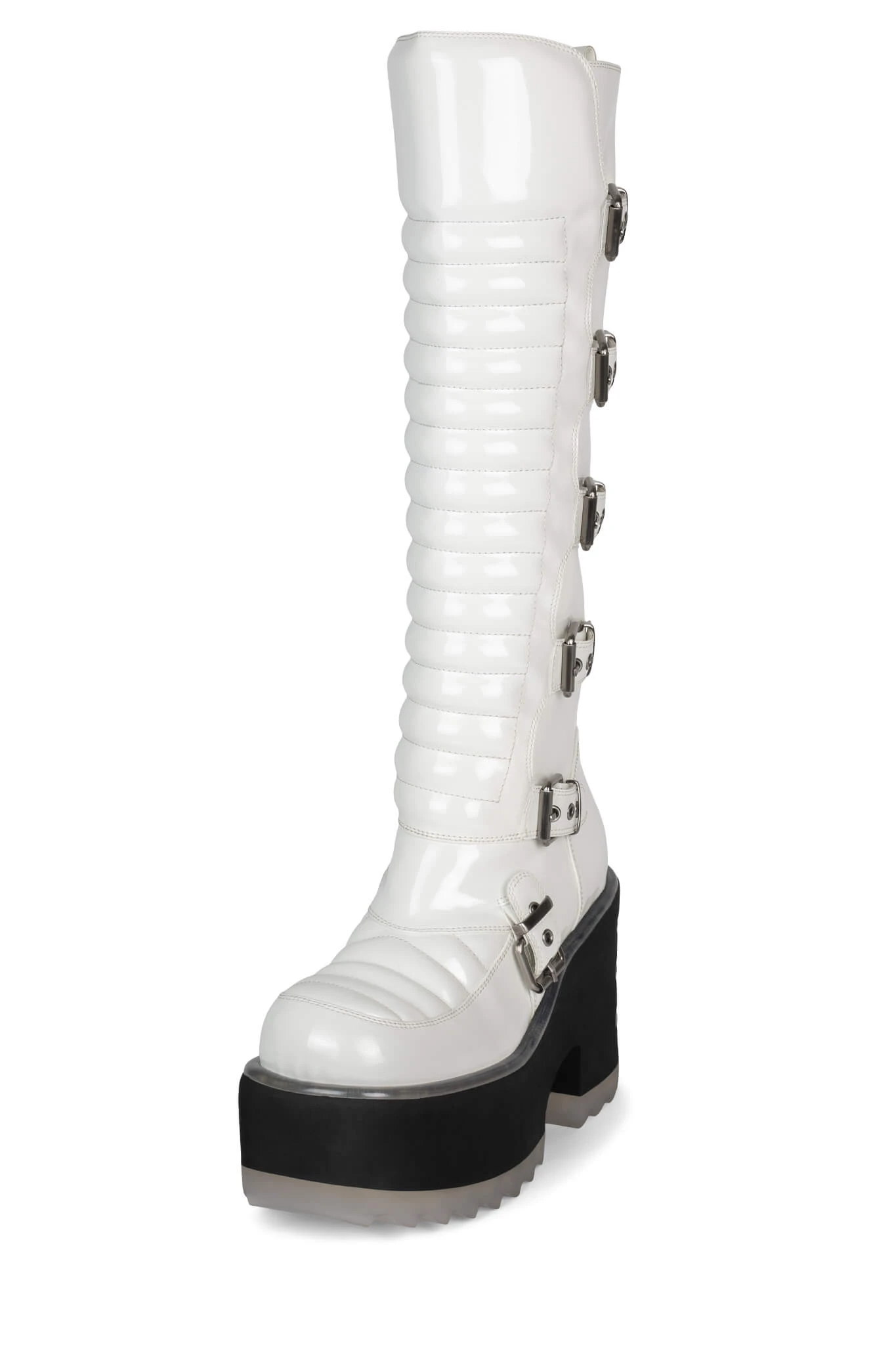 Knee-high moto boot with 90s rave-inspired clear tooth treaded sole