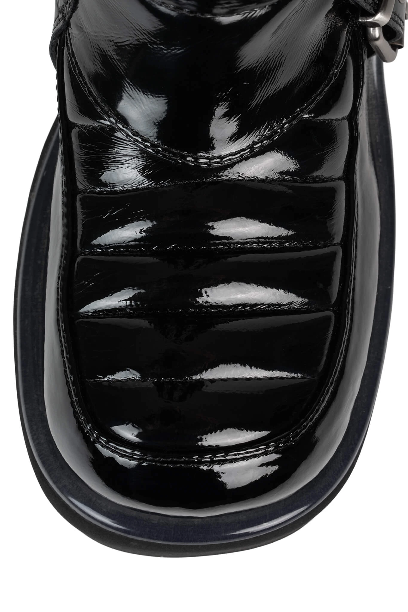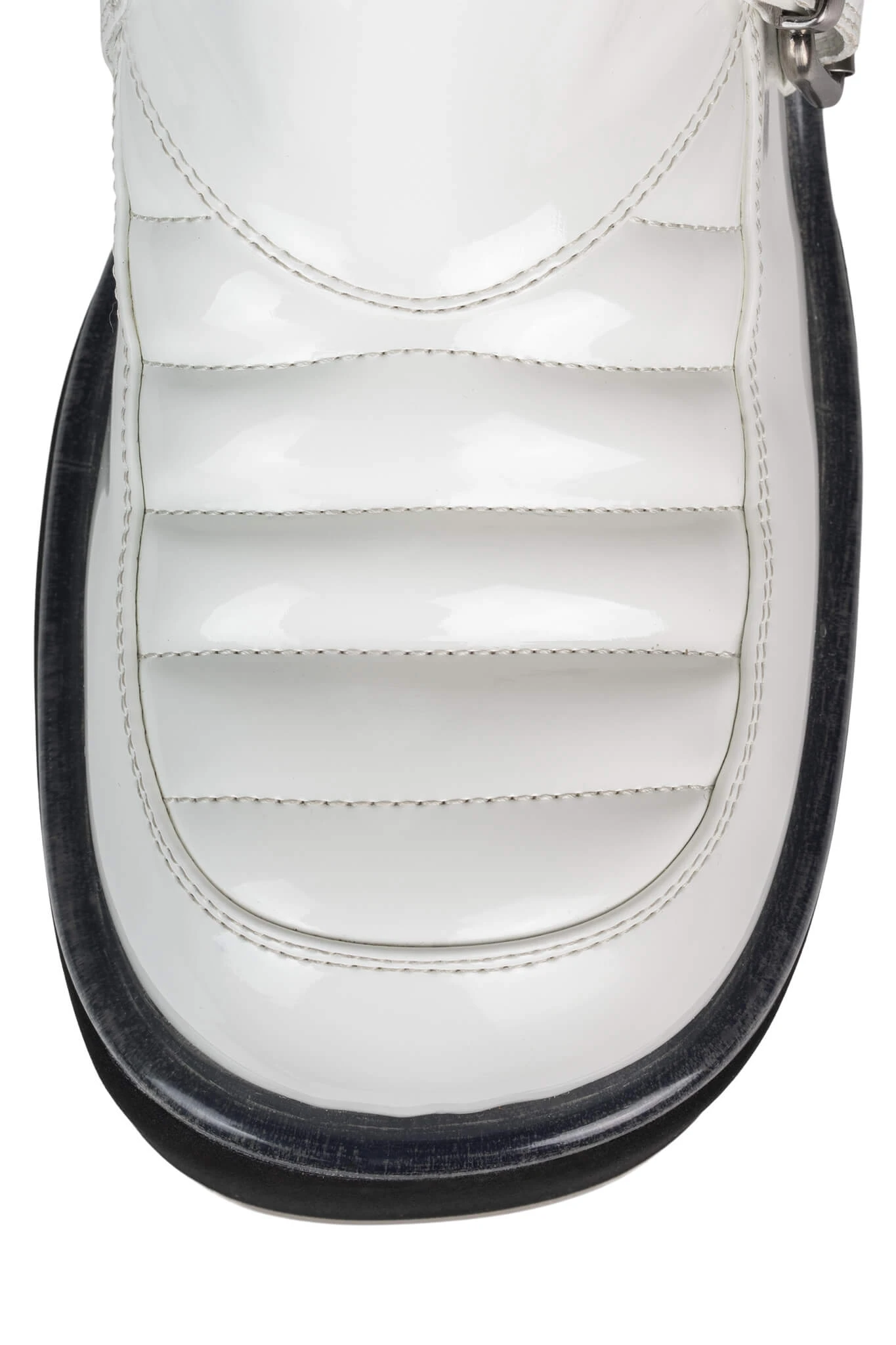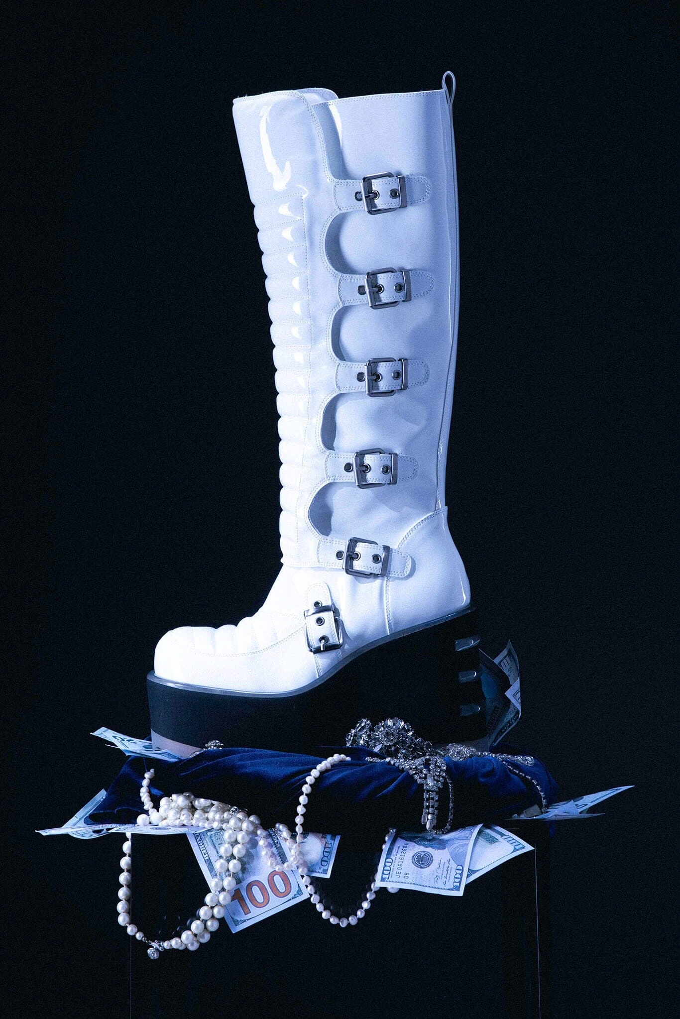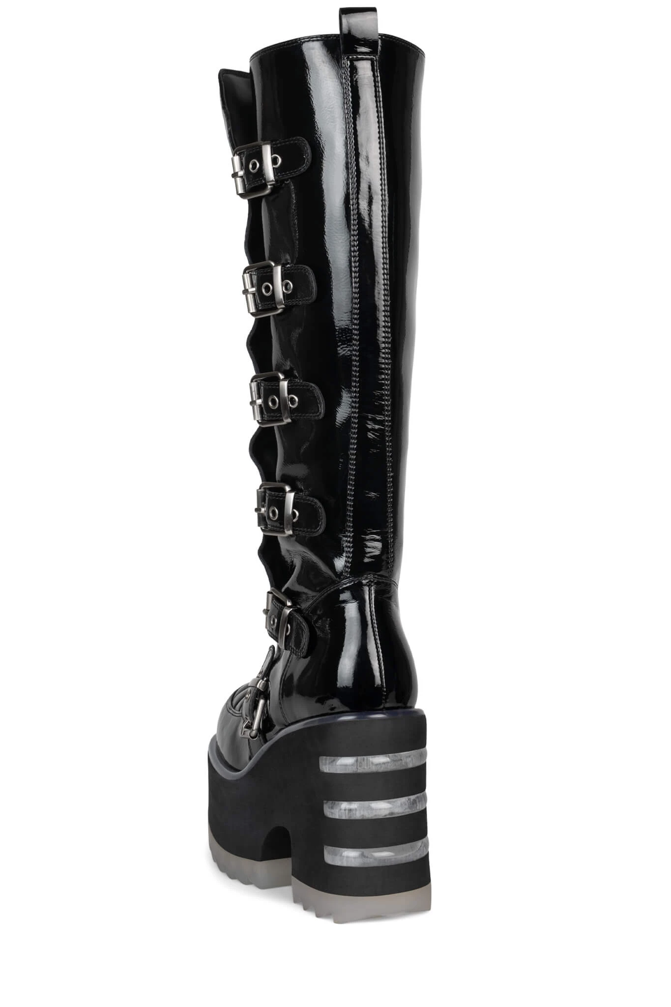 Knee-high moto boot with 90s rave-inspired clear tooth treaded sole